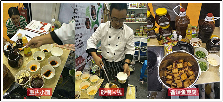 产品应用工程师使用新青大黄焖鸡酱、麻辣香锅酱、酸辣粉、土豆粉、重庆小面、瑞可莱肉香基等产品,做了多款地方特色风味小吃。