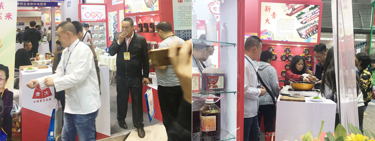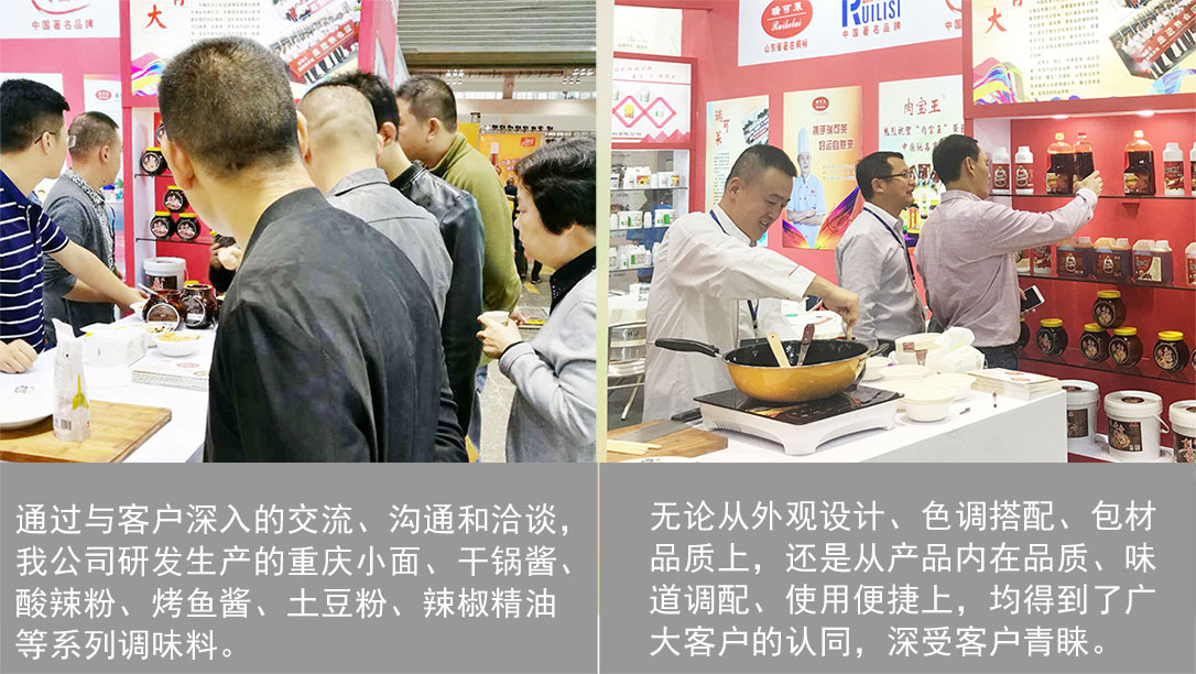 产品应用工程师使用新青大黄焖鸡酱、麻辣香锅酱、酸辣粉、土豆粉、重庆小面等产品,做了多款地方特色风味小吃。 吸引了大批客户的驻足品尝,所有菜品赢得了客户们的不断点头肯定,反响热烈。