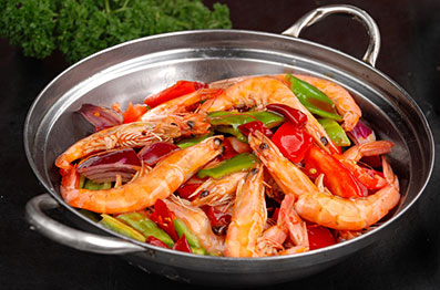 虾1000g、面粉30g、洋葱100g、青红椒各100g、麻花50g、菜色拉油1500g(实耗150g)、